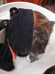 でんとりの方は流し方もちょっとやることがあるので、何もやってない方をタオルで隠しーの、まず、『でんとり』の右側にP3を付けて乳化(カラー剤はカラー剤でとるという技法。普段は少しのお湯を塗ってあるカラーに混ぜてモミモミします。シャンプー台でモミモミされるアレです。)します。